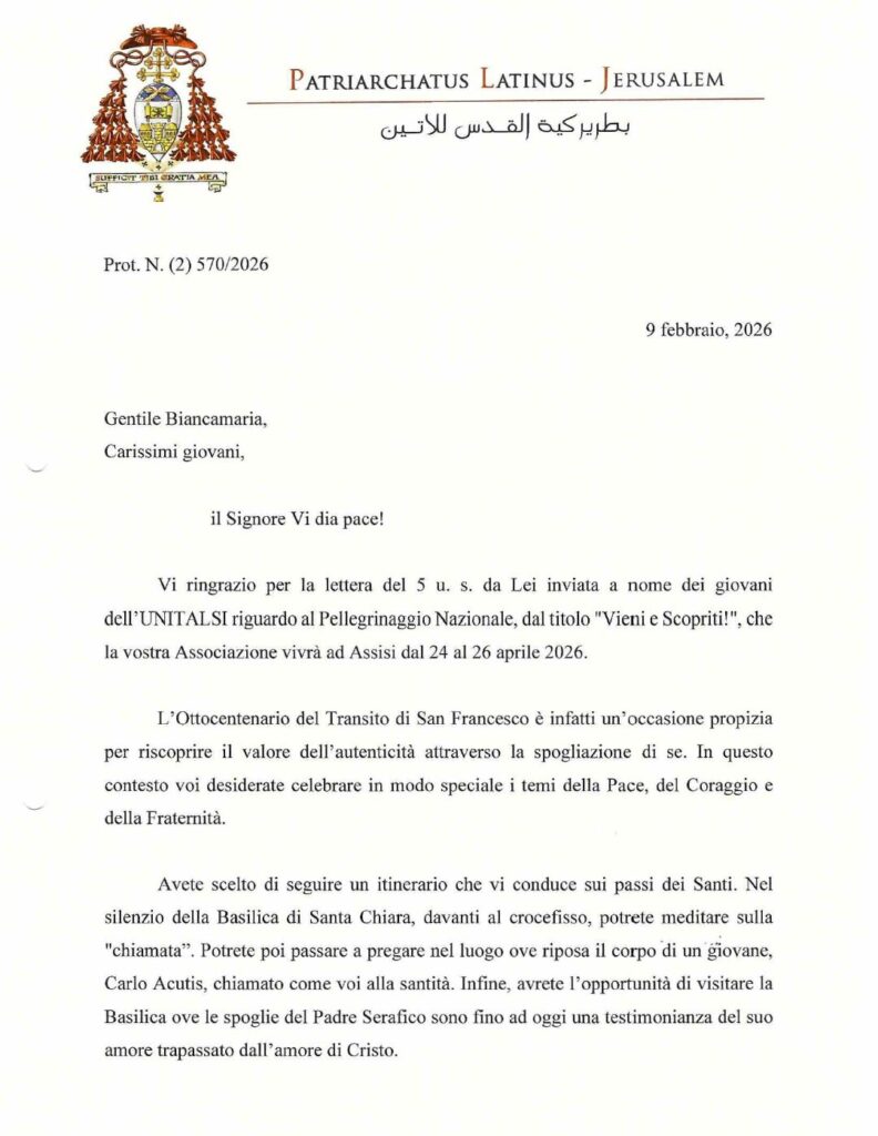 In vista del pellegrinaggio Nazionale dei Giovani Unitalsi in programma ad Assisi dal 24 al 26 aprile 2026, accogliamo con gratitudine il messaggio del Cardinale Pierbattista Pizzaballa, Patriarca di Gerusalemme dei Latini, che invita i giovani dell’Associazione a riscoprire l’autenticità della fede attraverso i valori della pace, del coraggio e della fraternità, sull’esempio di San Francesco. Il Patriarca, pur non potendo essere presente all’appuntamento in Umbria, assicura la sua vicinanza spirituale e accompagna i partecipanti con la preghiera dalla Terra di Gesù, affidando il cammino dei giovani all’intercessione della Vergine Maria. Il pellegrinaggio si configura così come un’occasione privilegiata di crescita interiore, nei luoghi segnati dalla testimonianza dei santi e dalla figura luminosa del giovane Carlo Acutis.