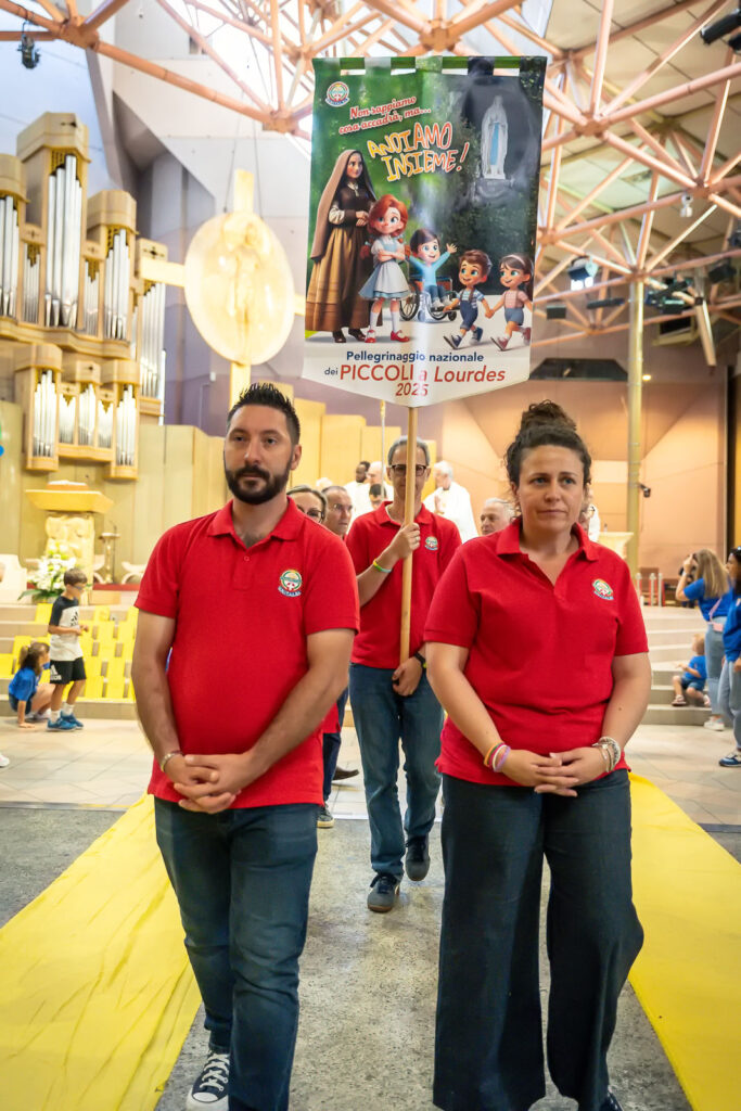 Il sentiero giallo, conosciuto anche come strada di mattoni gialli, è il percorso che Dorothy segue per raggiungere la città di Smeraldo e trovare il mago di Oz. Questo sentiero è un simbolo di crescita interiore e di scoperta di sé ed eccolo questo sentiero giallo nella chiesa di Santa Bernadetta a Lourdes per questo nuovo intenso giorno del pellegrinaggio dei piccoli seguendo proprio la narrazione del mago di Oz. Ai piedi dell’altare sui gradini sono stati posizionati mattoncini gialli che riportano i nomi di tutti i bimbi che stanno vivendo questa esperienza straordinaria a Lourdes voluta dall’Unitalsi.