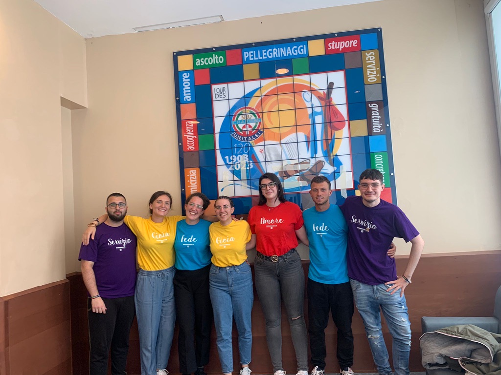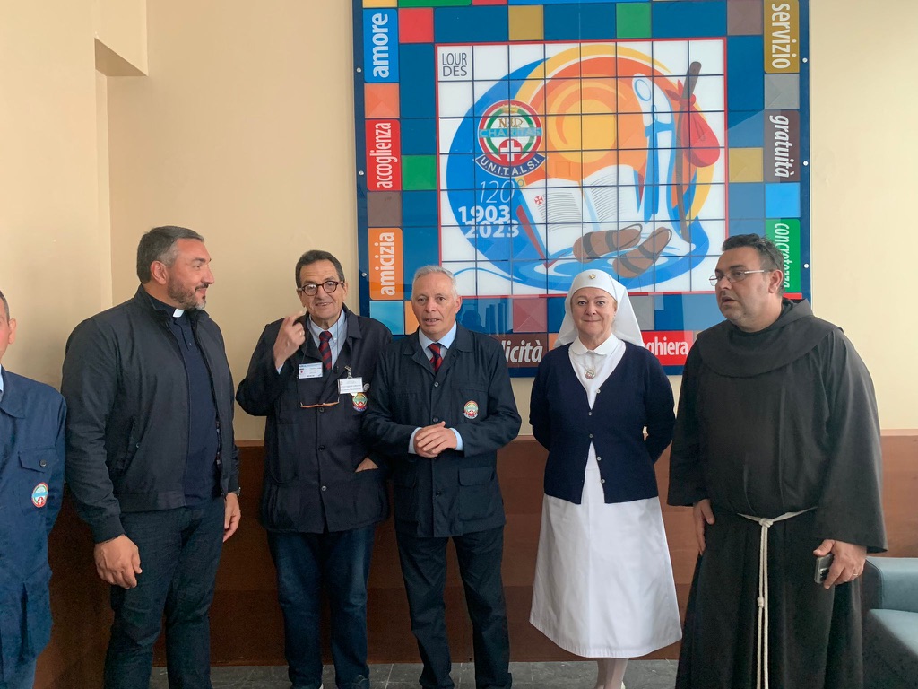 Logo dei 120 anni dell’Unitalsi al Salus. Le Sezioni Calabrese e Umbra hanno posto le prime mattonelle che andranno a raffigurare l’immagine che già si intravede sulla parete al piano terra della nostra casa: il Salus Infirmorum.