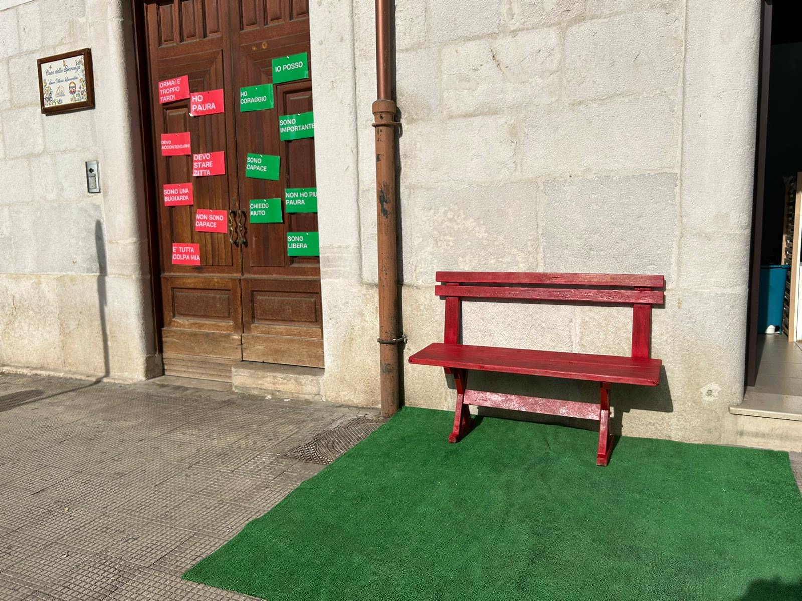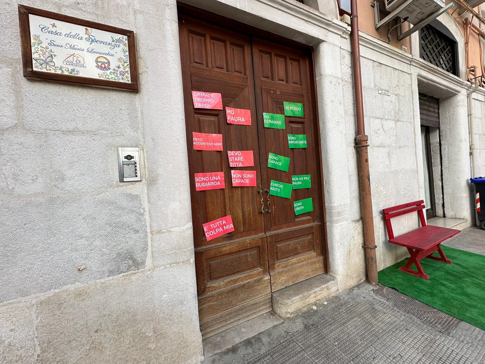 Sulla porta d’ingresso, i messaggi di colore rosso indicano le forme di violenza più frequenti e messaggi di colore verde le forme di aiuto. E a pochi passi dall’ingresso della casa spicca una panchina rossa.