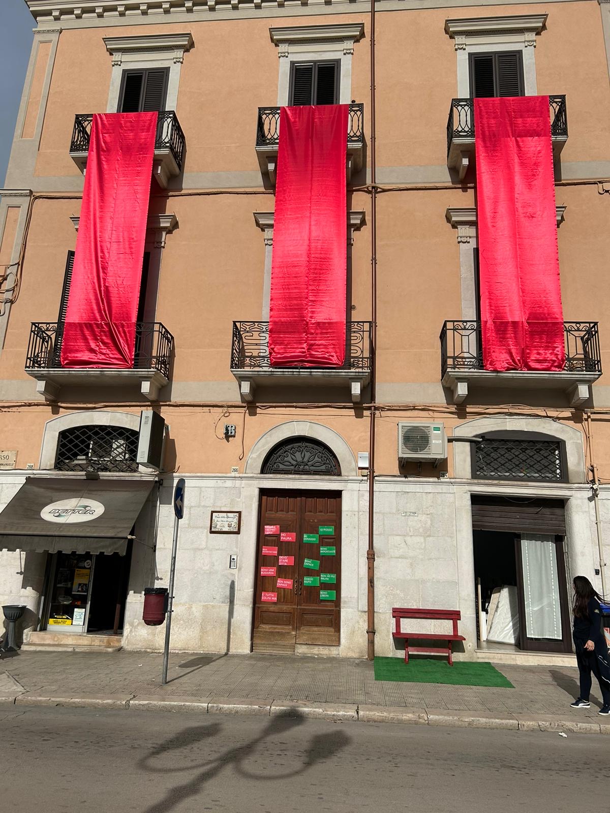 Teli rossi distesi ricoprono Casa della Speranza, la struttura nata da un progetto di solidarietà in collaborazione con la Fondazione Lamacchia che ospita donne con figli o prossime al parto in situazioni di disagio.