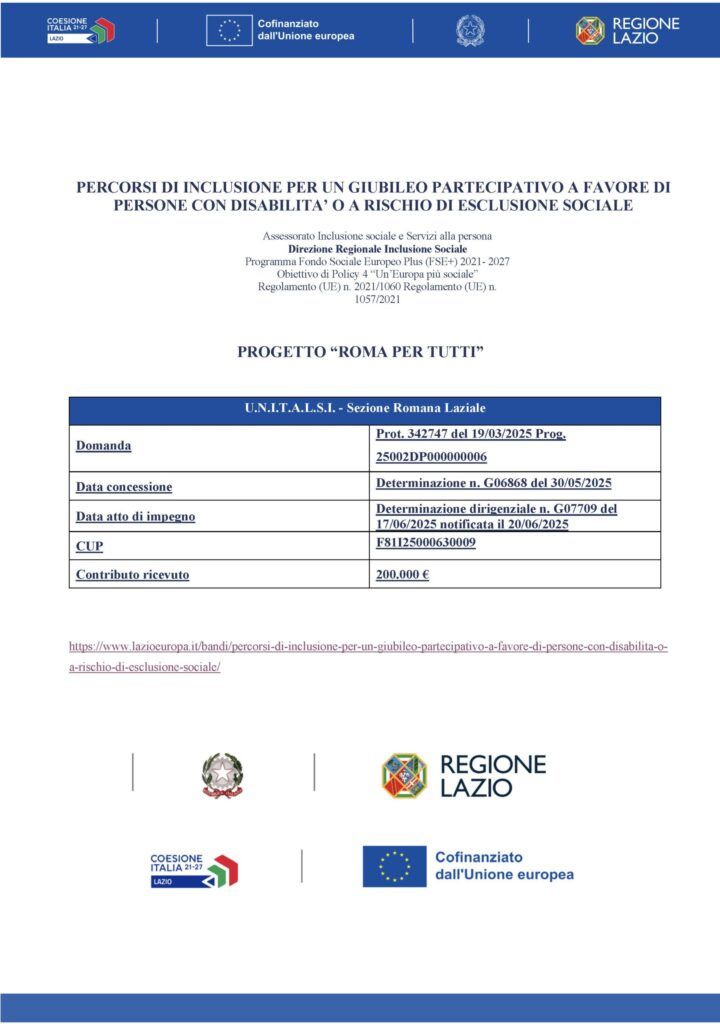 ROMA PER TUTTI è finanziato dall’Unione Europea nell’ambito del Programma Regionale FSE+ 2021–2027 della Regione Lazio – Priorità Inclusione Sociale. Il sostegno finanziario ricevuto ammonta a € 200.000,00, risorse destinate a promuovere interventi concreti a favore dell’accessibilità, dell’inclusione e della piena partecipazione alla vita sociale e culturale del territorio.