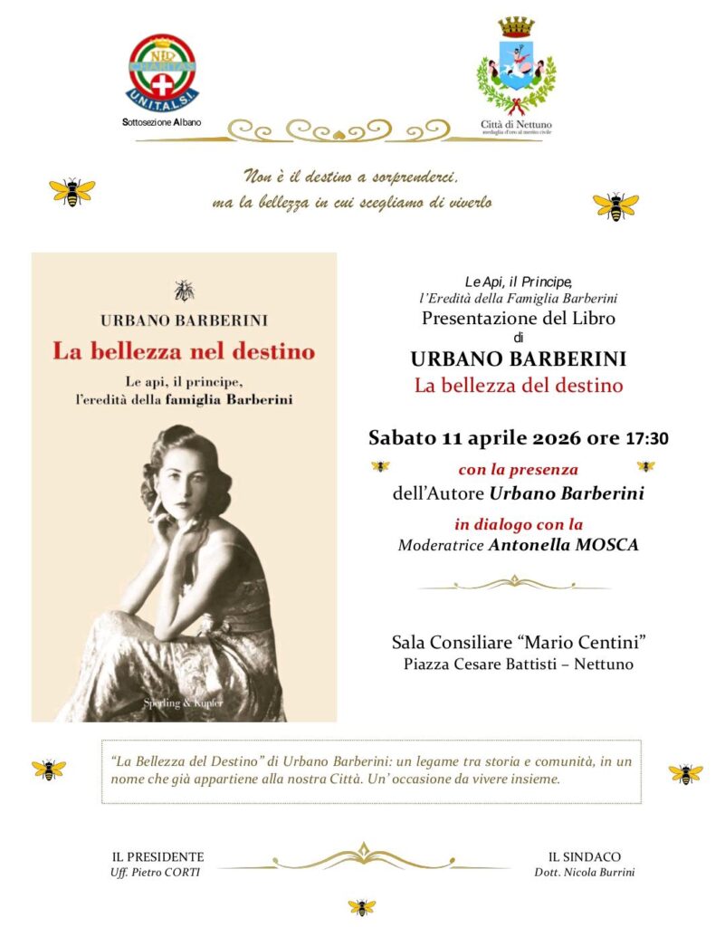 Sabato 11 aprile, presso la Sala Consiliare del Comune di Nettuno, si terrà un importante appuntamento culturale: la presentazione del libro La bellezza del destino” di Urbano Barberini. L’evento è stato accolto con favore dal Sindaco di Nettuno e dall’Assessore alla Cultura, che hanno concesso la Sala Consiliare del Comune per lo svolgimento dell’iniziativa.
