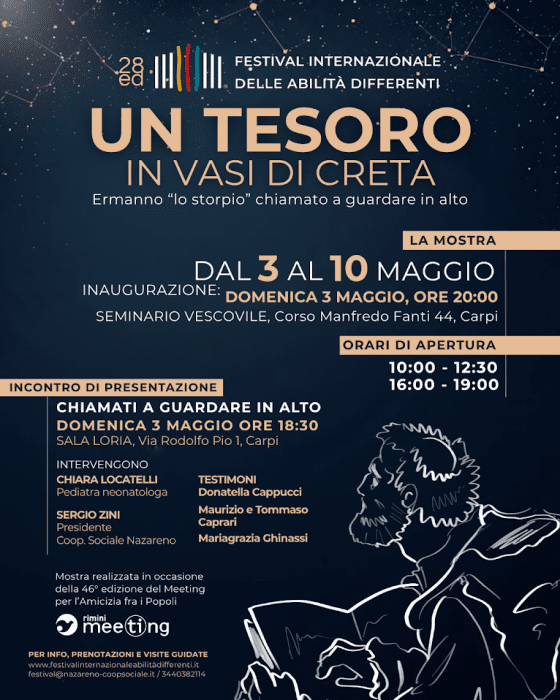 A seguire alle 20:00, presso il Seminario Vescovile, ex Collegio dei Gesuiti (Corso Manfredo Fanti), si terrà l’inaugurazione ufficiale della mostra “Un tesoro in vasi di creta – Ermanno lo storpio chiamato a guardare in alto”, realizzata in collaborazione con il Meeting di Rimini 2025.