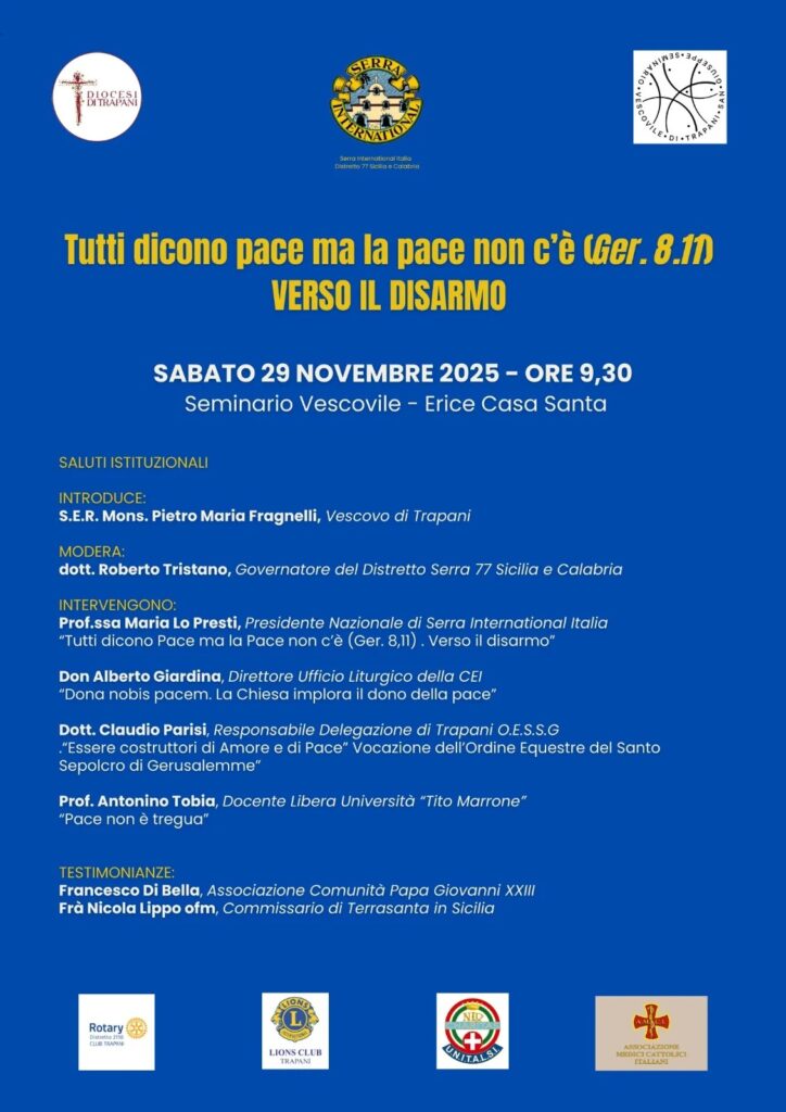 Tutti dicono pace ma la pace non c’è (Ger 8,11). Verso il disarmo. È il tema del convegno che si terrà sabato 29 novembre p.v. con inizio alle ore 9.30 presso il Seminario vescovile di Trapani (via Cosenza, 90 Erice Casa-Santa). L’incontro promosso dalla Diocesi insieme al Serra Club International Distretto 77 Sicilia-Calabria e al Seminario vescovile “San Giuseppe” metterà a fuoco il tema dell’educazione alla pace disarmata e disarmante, secondo l’espressione di papa Leone XIV, con un confronto aperto alle istituzioni e associazioni del territorio.