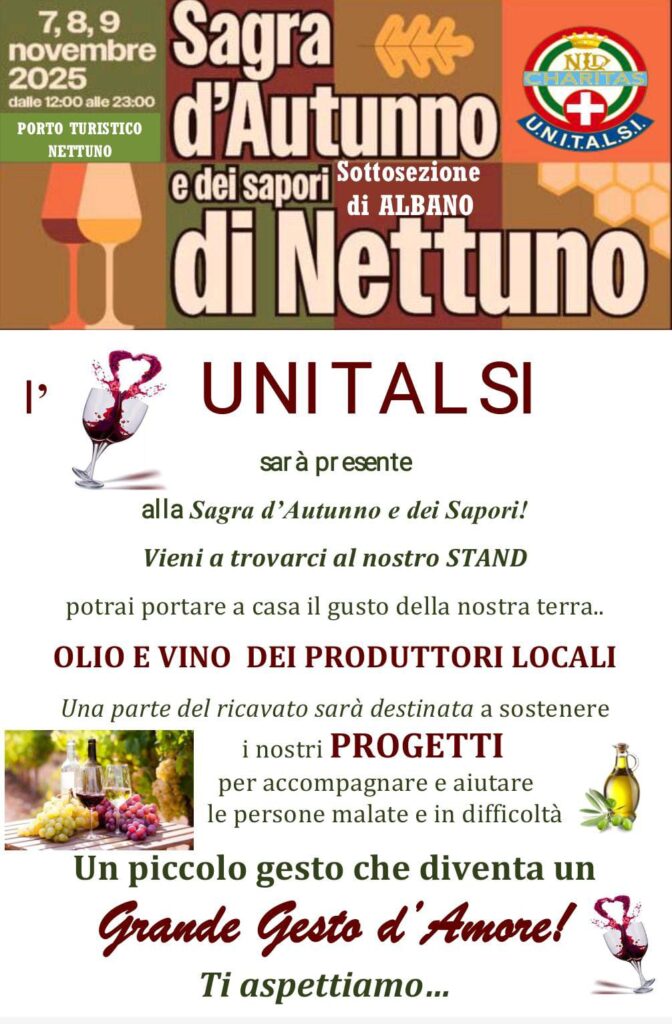 Dal 7 al 9 novembre 2025, al Porto Turistico di Nettuno, torna la Sagra d’Autunno e dei Sapori di Nettuno: tre giorni dedicati alla tradizione, ai profumi e ai sapori del nostro territorio. Tra caldarroste, musica, mercatini e specialità locali, ci saremo anche noi, i volontari dell’Unitalsi di Albano, con il nostro stand solidale.