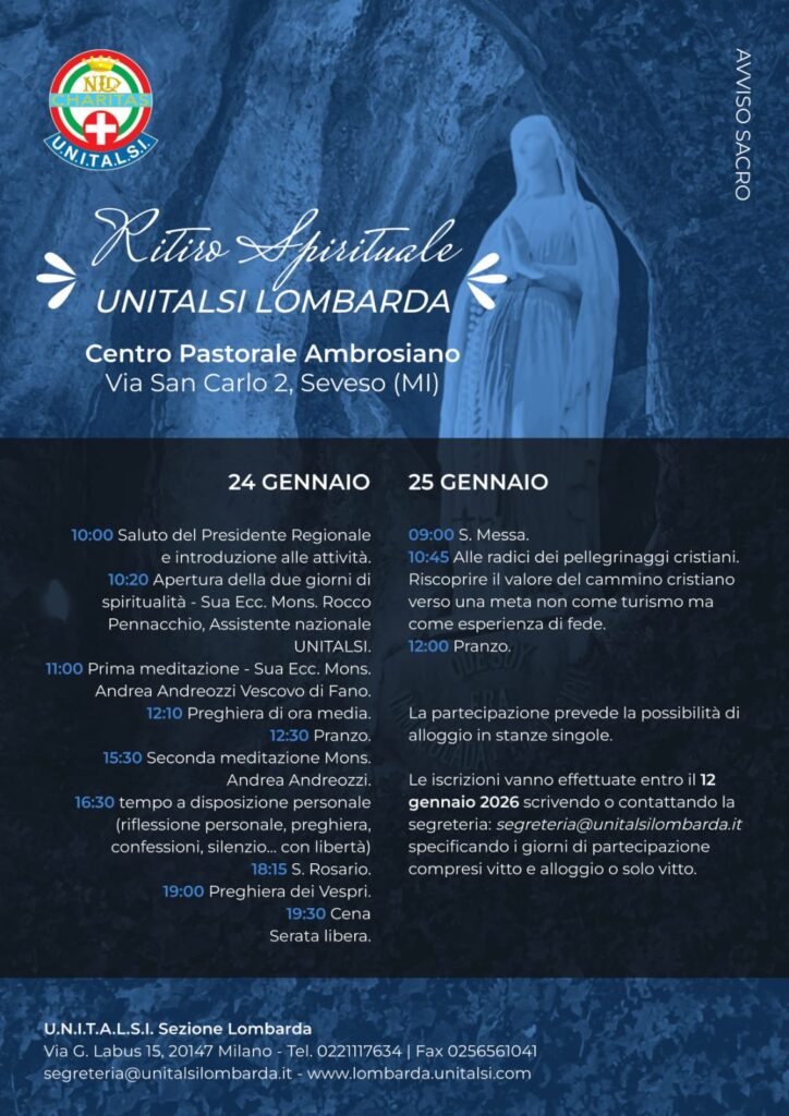 La Sezione Unitalsi Lombarda organizza il ritiro spirituale regionale, in programma sabato 24 e domenica 25 gennaio 2026 presso il Centro Pastorale Ambrosiano, in Via San Carlo 2 a Seveso (MI). Un appuntamento di approfondimento spirituale e di preghiera rivolto ai soci, ai volontari e a tutti coloro che desiderano vivere un tempo di silenzio, meditazione e condivisione nella fede.