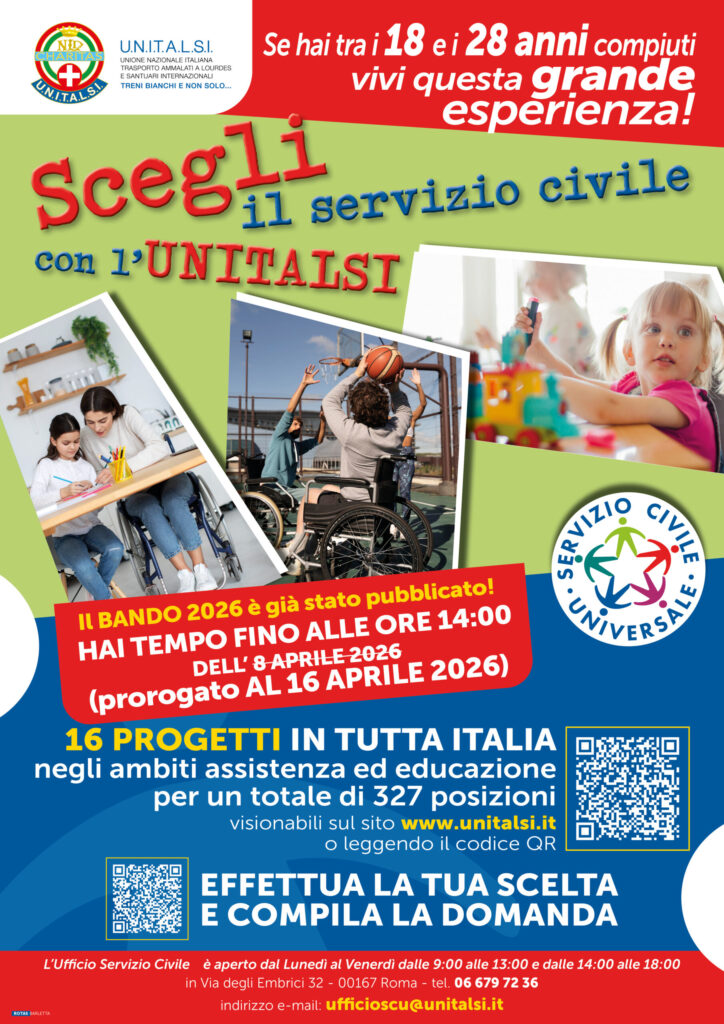 One thought on “Servizio Civile Universale con l’Unitalsi – BANDO VOLONTARI 2026”